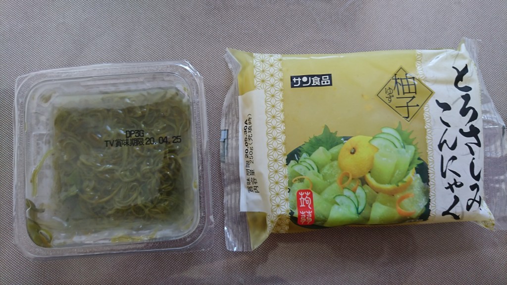 まずめかぶと刺身こんにゃくです♪知人にはめかぶよりもずくのほうが酢が取れていいんじゃないかって言われましたがめかぶの方が食感が良くて好きです笑